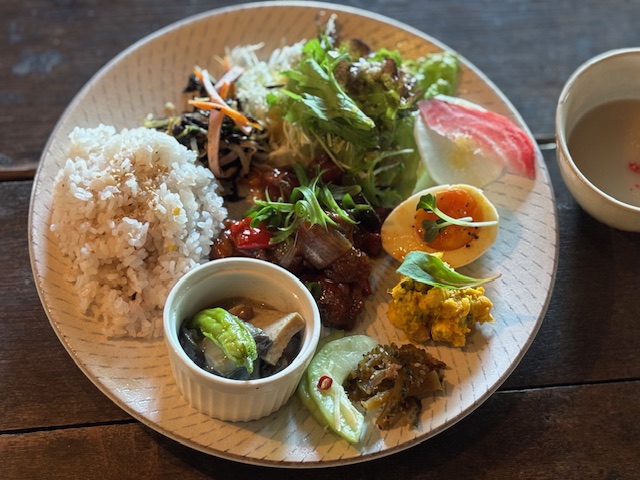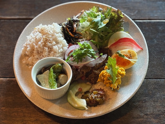 カレー粉をまぶして焼いた薄切り牛肉と冷たいトマトに紫玉ネギと香味野菜をトッピング.